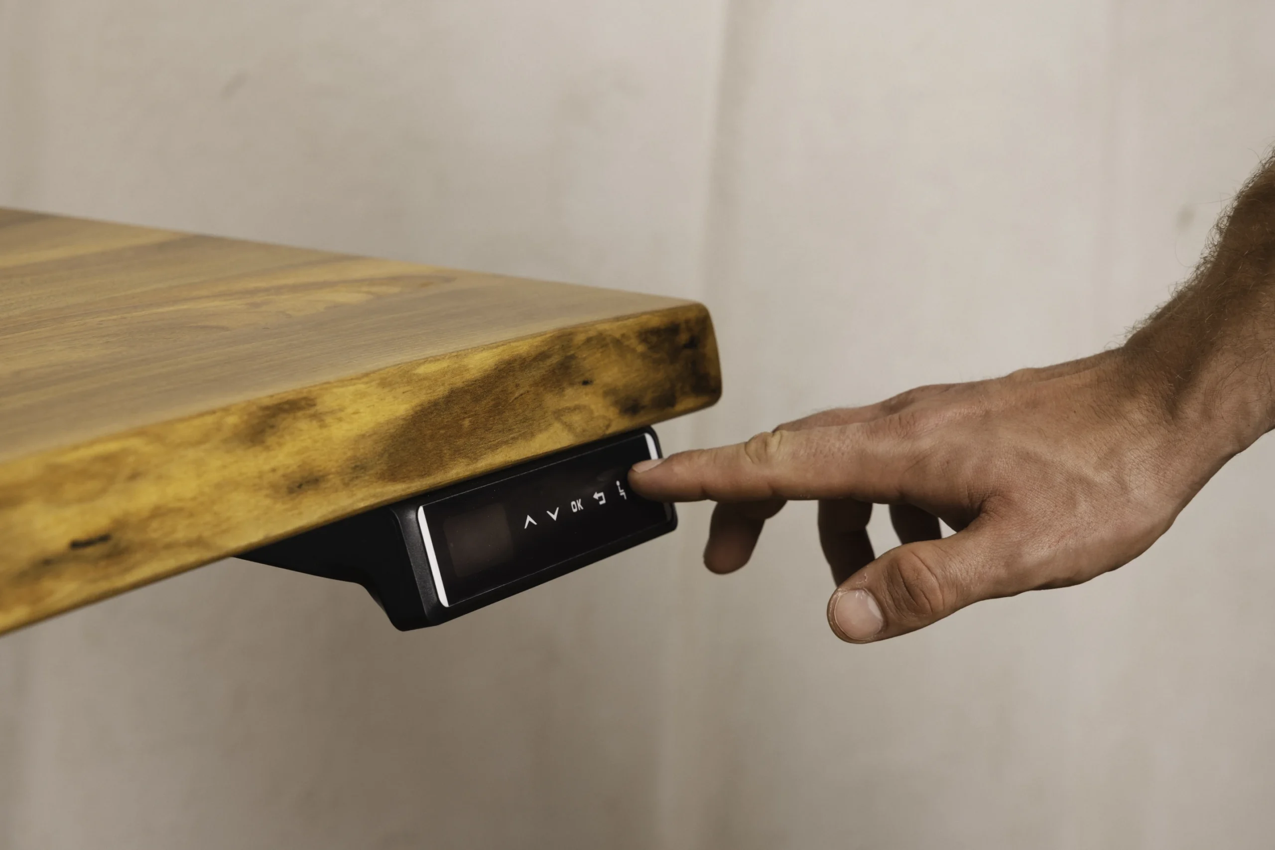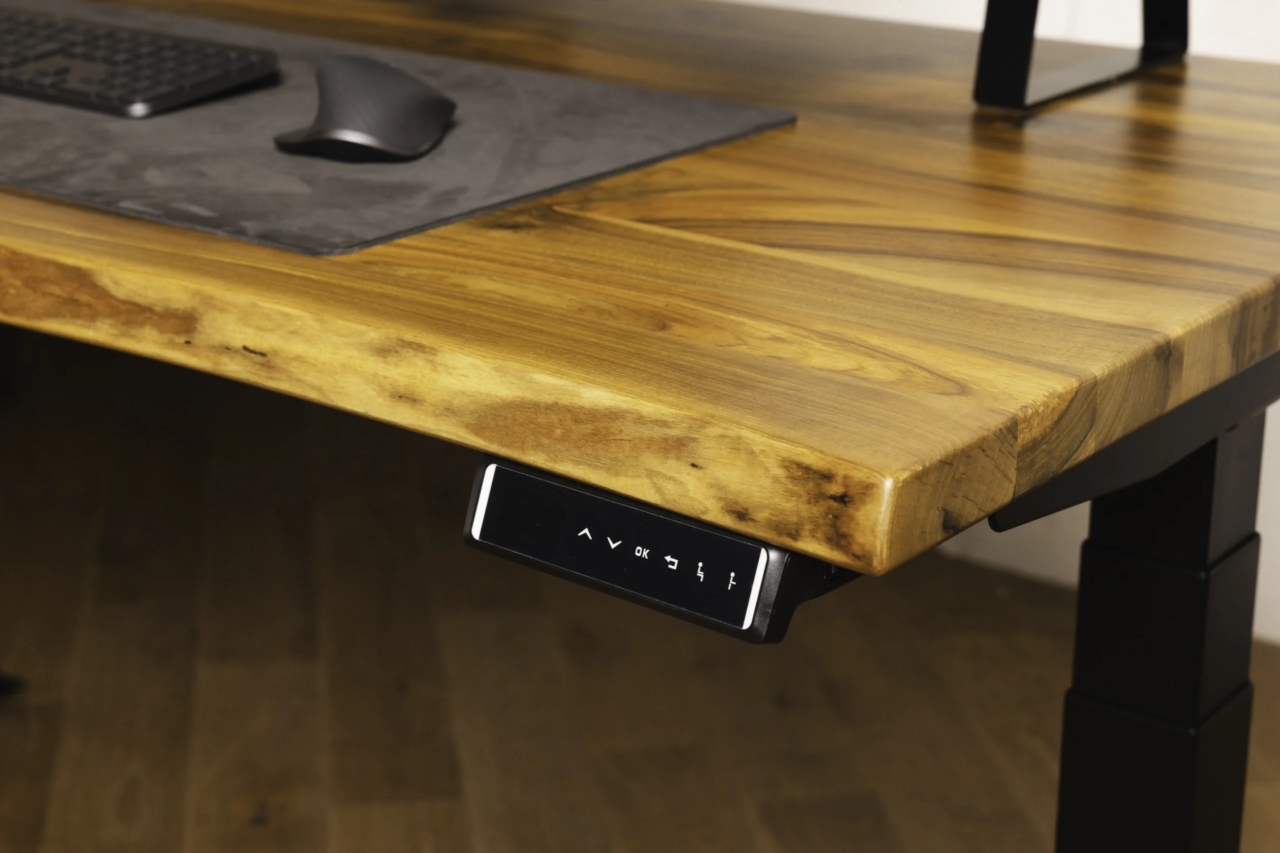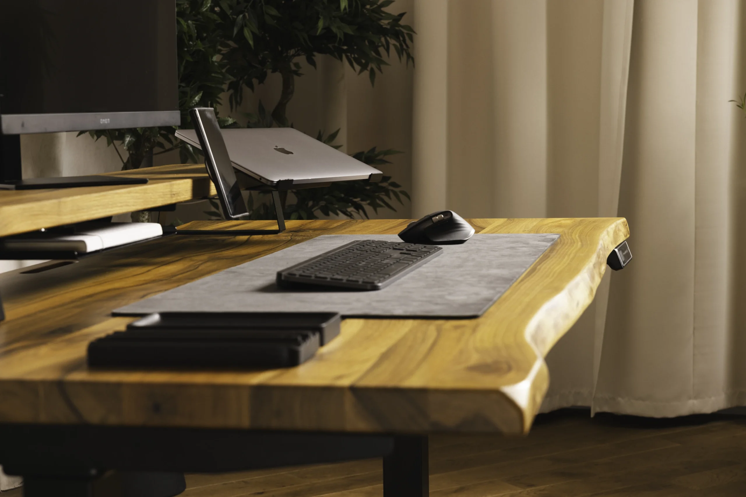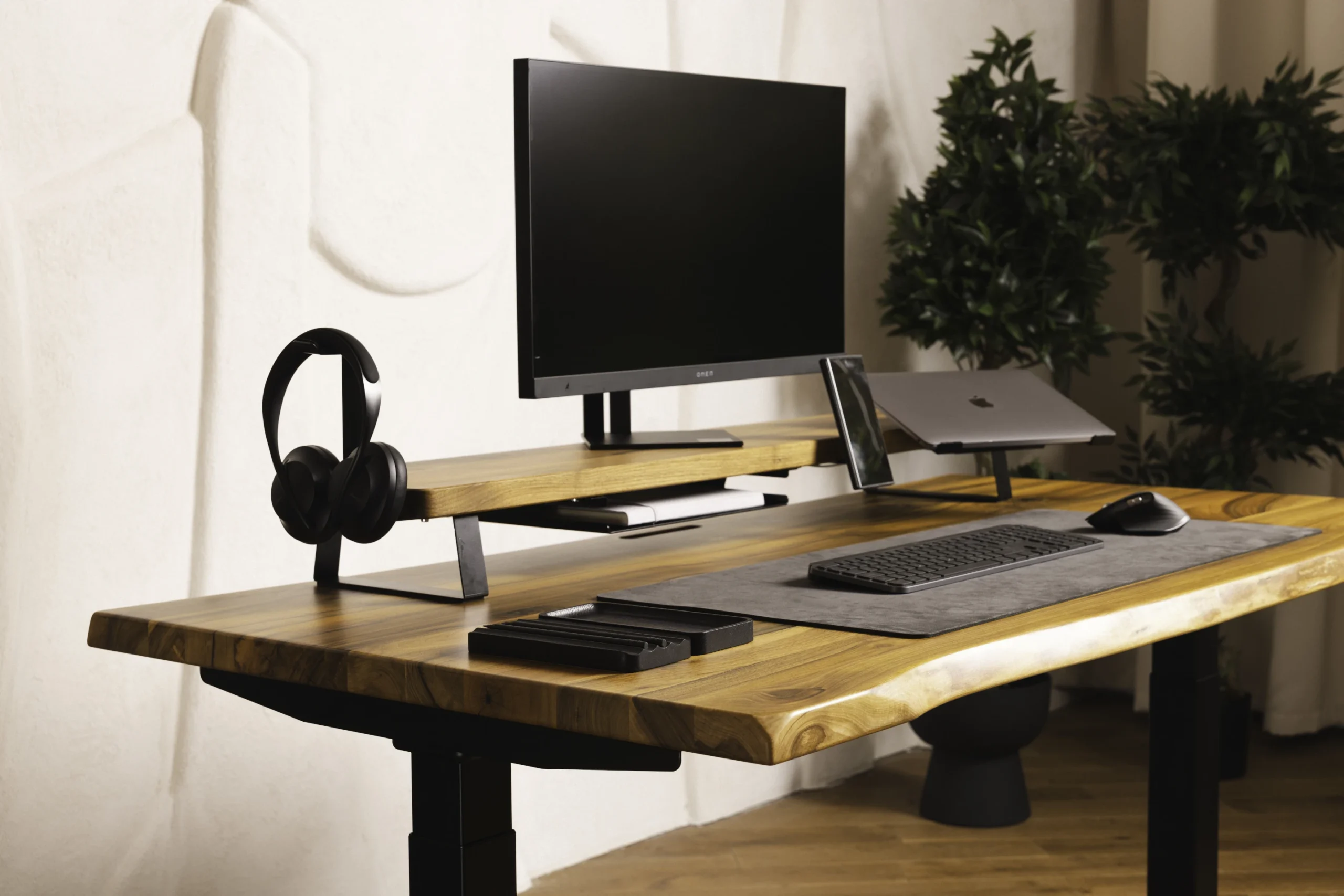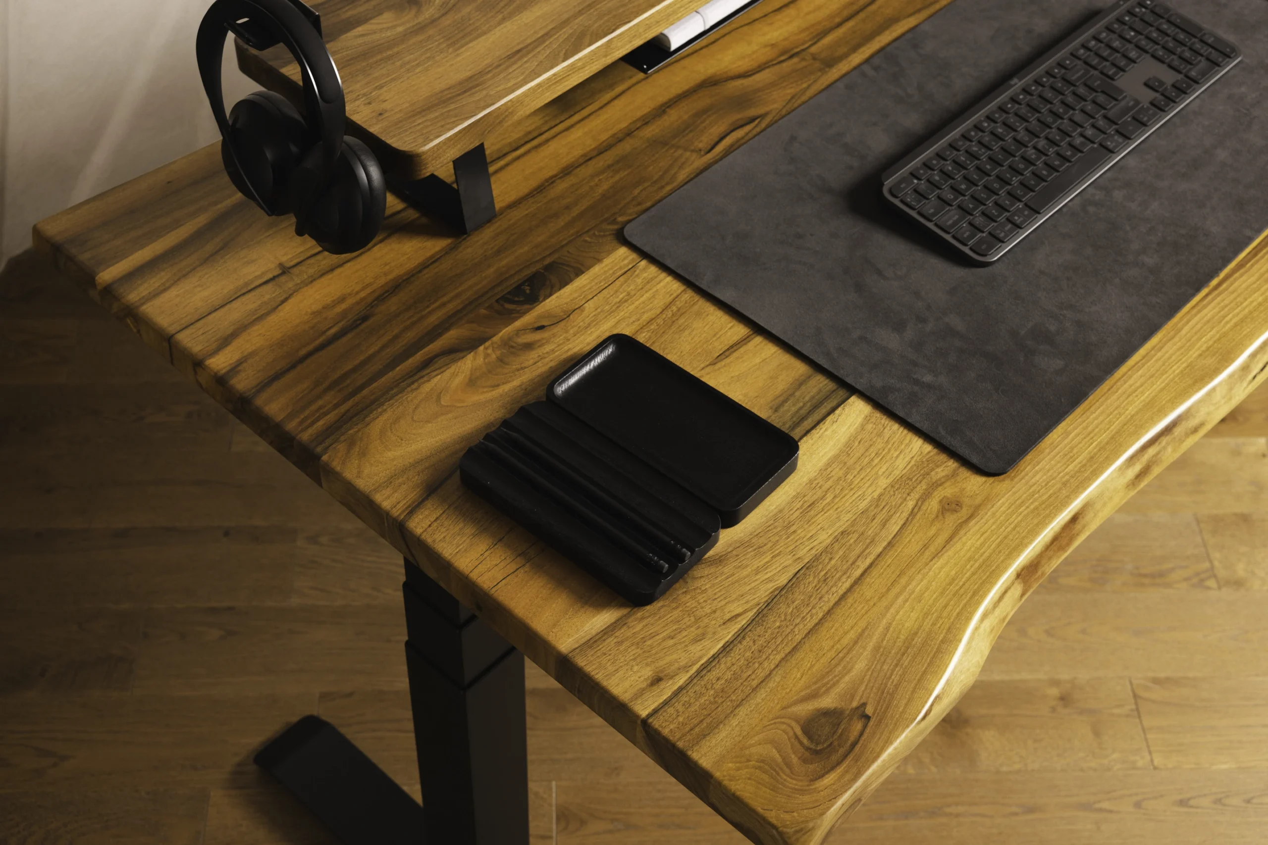 Biurko z litego orzecha włoskiego z niepowtarzalną krawędzią live-edge. Stelaż jaki został użyty to model PREMIUM, nasz najpopularniejszy i najbardziej polecany model. Na biurku stoi półka modułowa wykonana z orzecha włoskiego, zostały do niej zamontowane takie dodatki jak uchwyt na słuchawki, półka na dokumenty, stojak na laptopa, oraz ładowarka MagSafe do iPhone. Na biurku leży wyjątkowa mata robiona na zamówienie, wykonana z włoskiej alcantary.